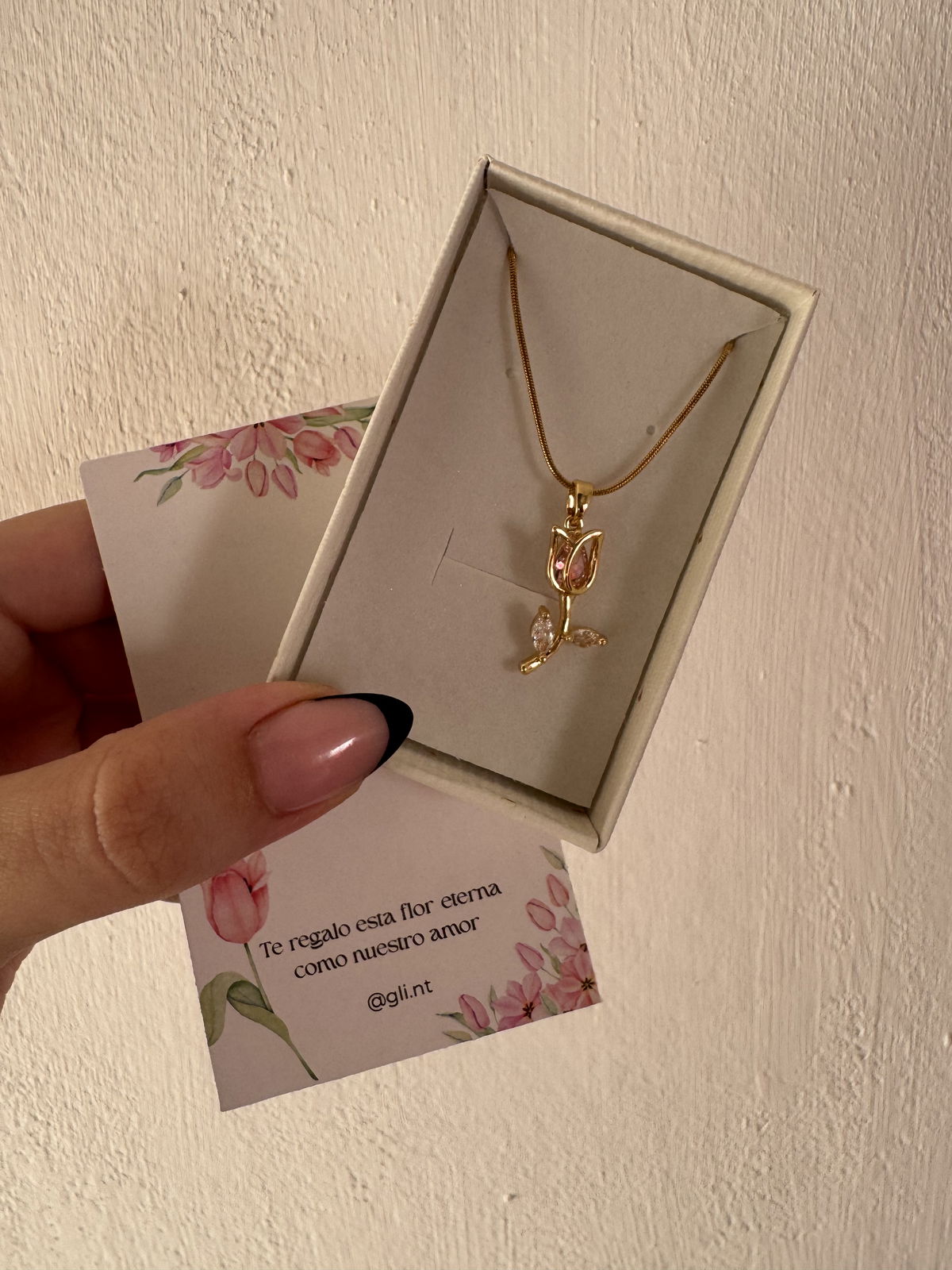 Collar con dije con cubic rosa y micro pave cristal de cobre con baño oro y cadena de acero quirurgico