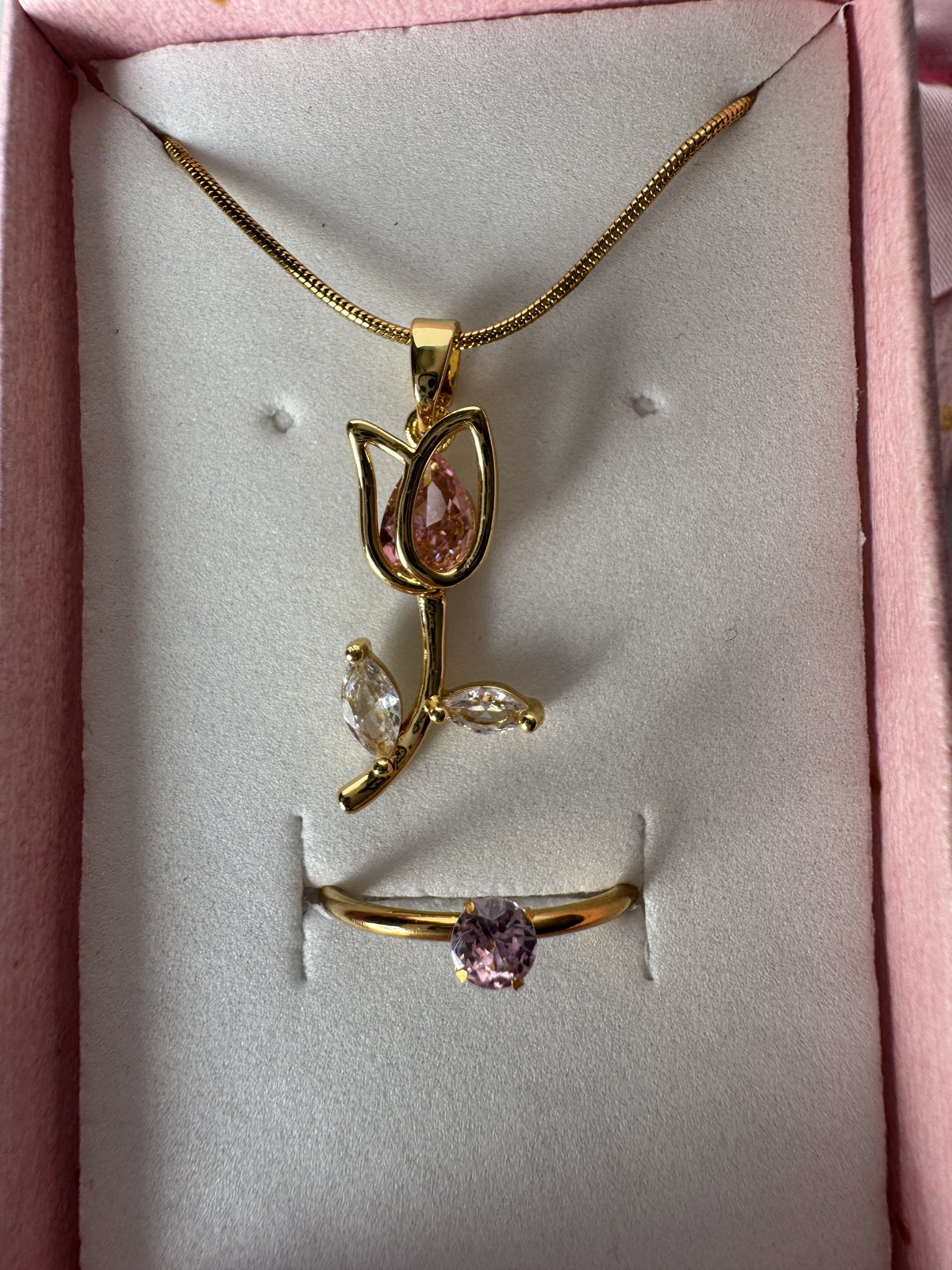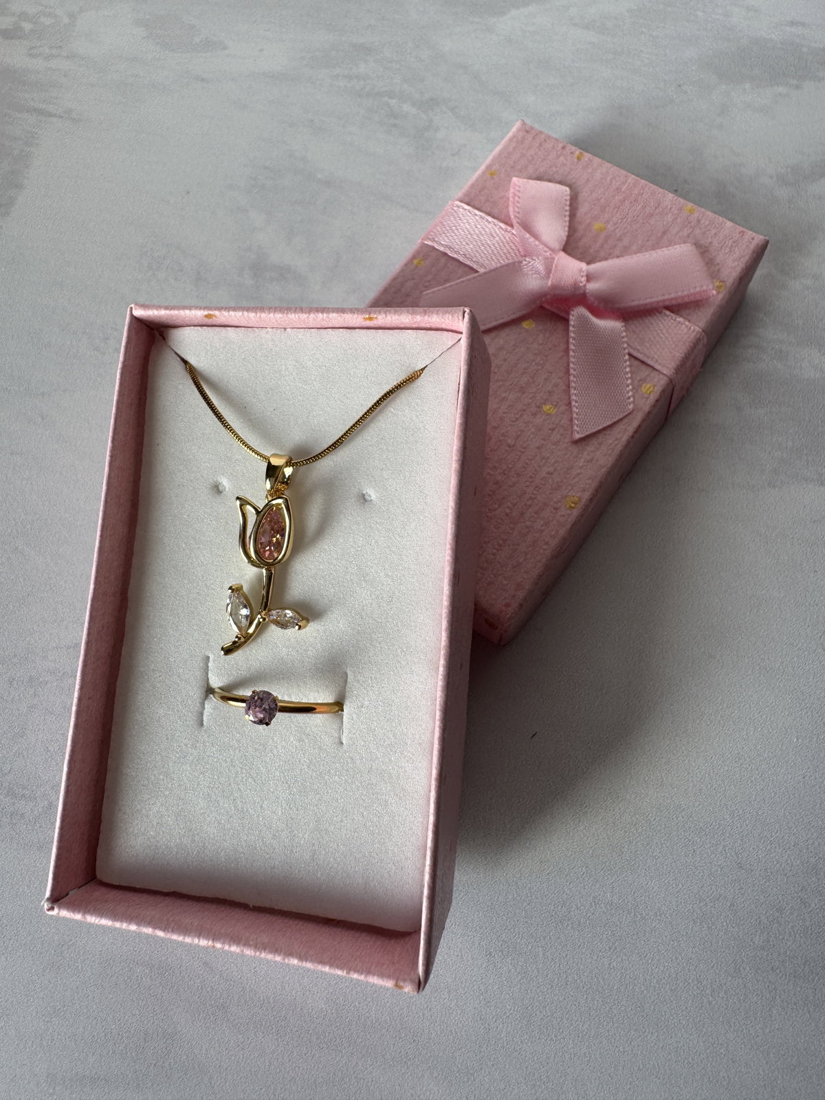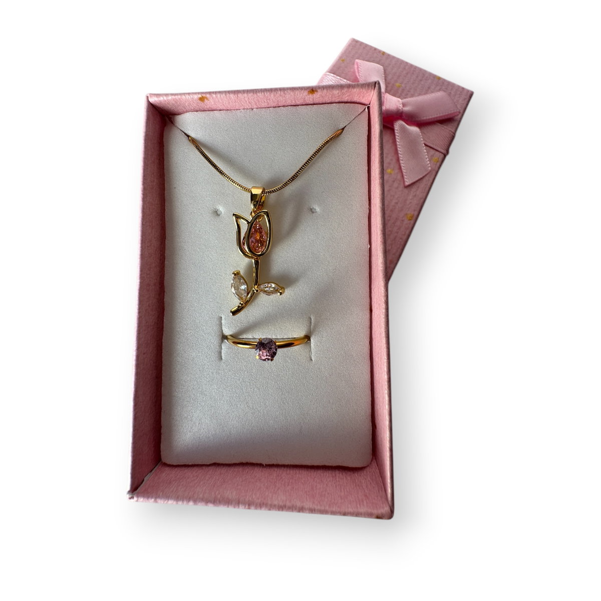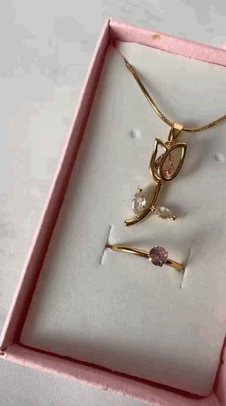 Este set incluye un anillo y un collar mas un estuche de regalo, el color del estuche es aleatorio