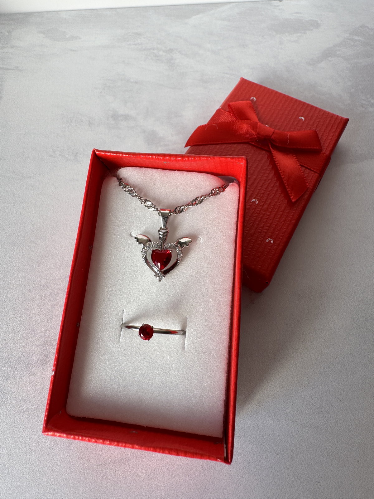 Este set incluye un anillo y un collar mas un estuche de regalo, el color del estuche es aleatorio