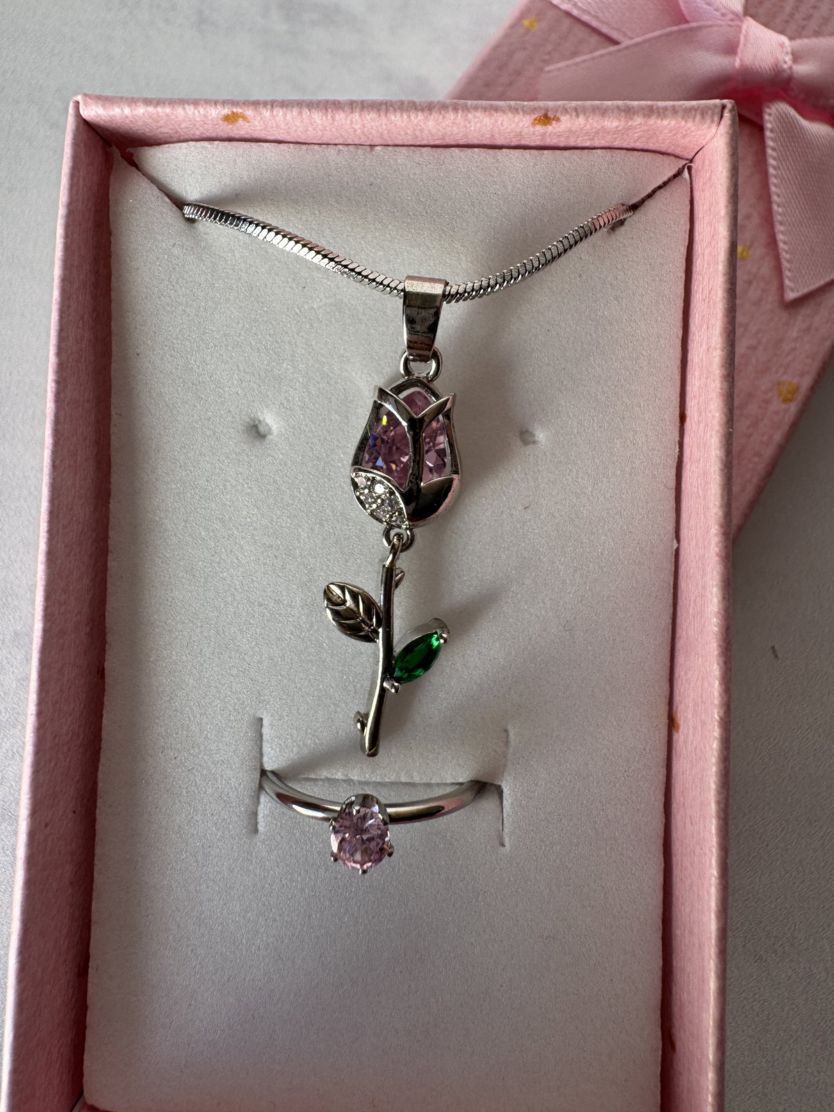 Este set incluye un anillo y un collar mas un estuche de regalo, el color del estuche es aleatorio